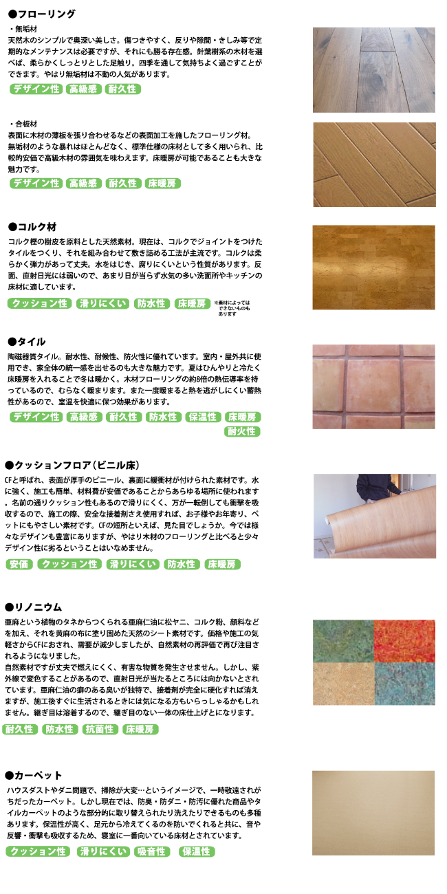 床が変わると、部屋全体の印象が大きく変わります。ご存知の通り、床材にも様々な種類があり、特徴も異なります。掃除の頻度や時間、室内履きの有無、床に座るのかイスに座るのか等など・・・。どんな暮らしをしたいかで選ぶ床材も変わります。